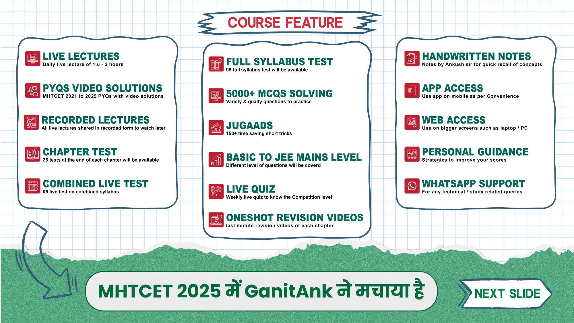 With the quizzes and live tests practice what you learned, and track your class performance.